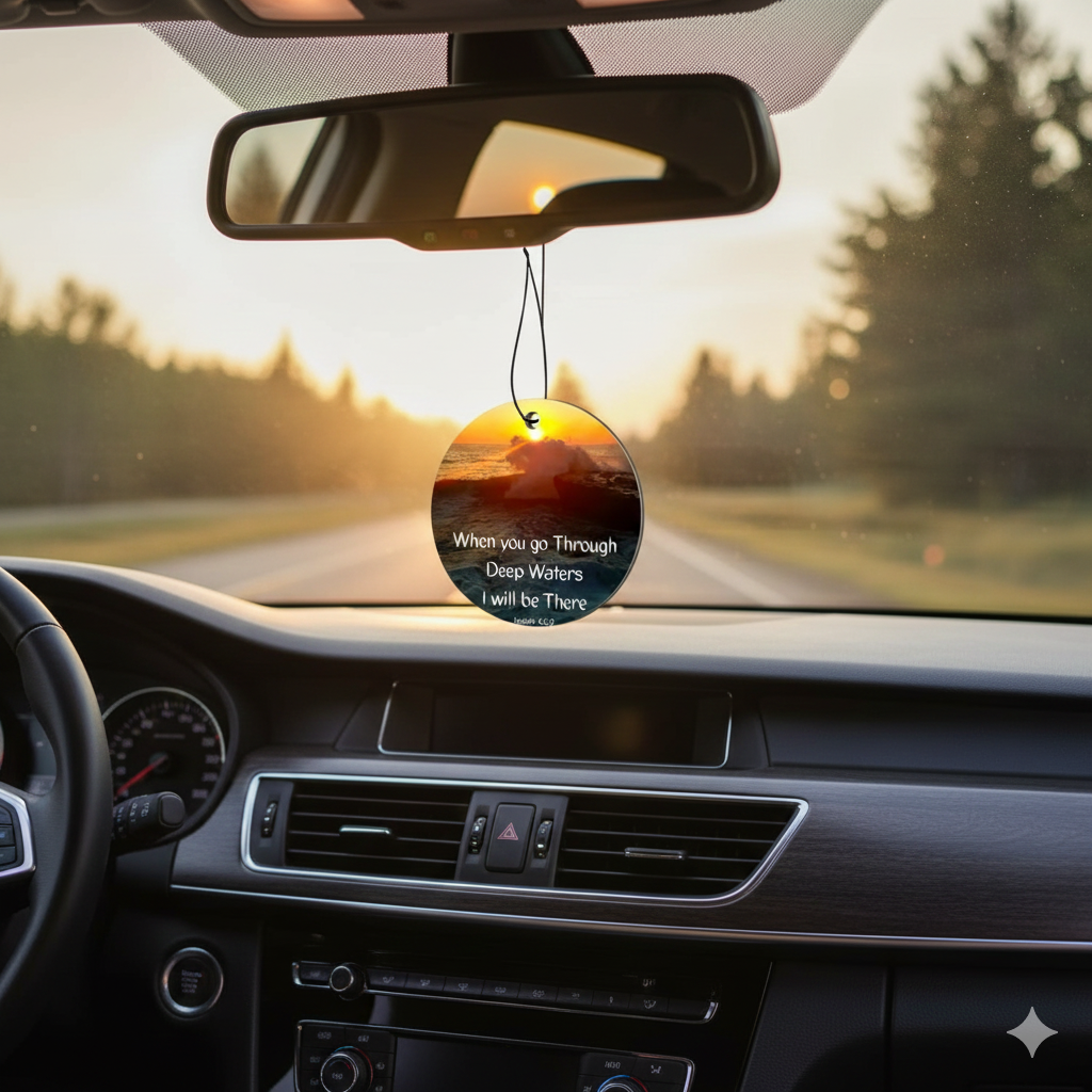 Carry peace on every journey. Transform your car into a sanctuary with this beautiful, double-sided air freshener. Featuring a breathtaking sunset over crashing waves and the powerful promise of Isaiah 43:2, "When you go through deep waters, I will be there," it serves as a steady reminder that you never travel alone.